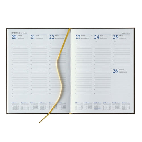 Agenda 2026 Semanal Secretária Papiro Madrid A24 apresenta uma disposição semanal por página, ideal para quem gosta de ter uma visão global da semana num só olhar.