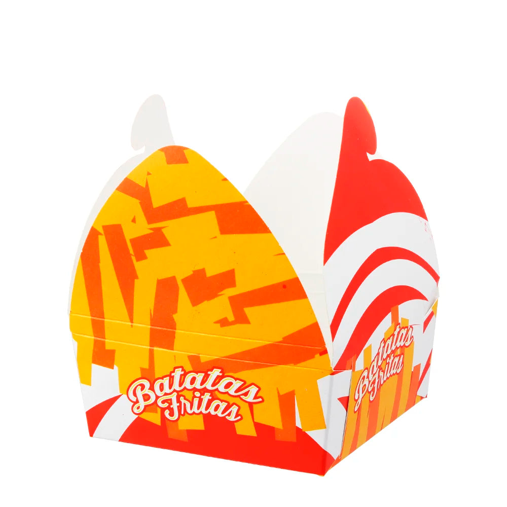 Caixa papel para batatas fritas 12x12cm com ilustração vibrante. Resistente, empilhável e reciclável. Ideal para take-away, eventos e street food.